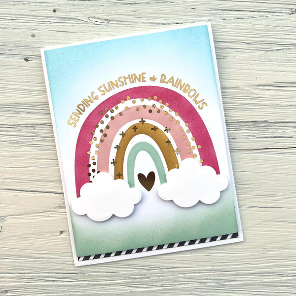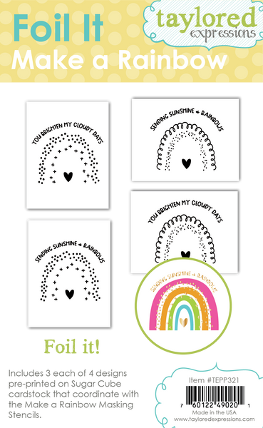 The Foil It - Make A Rainbow panels are a whimsical pleasure to get rainbow-tastic with! These panels are fun to foil in solids or patterned foils and coordinate with the Make a Rainbow Masking stencils (sold separately). Simply foil and blend on inks in a variety of rainbow shades. The panels offer horizontal and vertical orientations, with two different sentiments printed in whimsy sweet fonts, sure to brighten someone's day! Sentiments include: You Brighten My Cloudy Days, Sending Sunshine & Rainbows. Includes 3 each of 4 designs pre-printed on Sugar Cube cardstock that coordinate with the Make a Rainbow Masking Stencils.