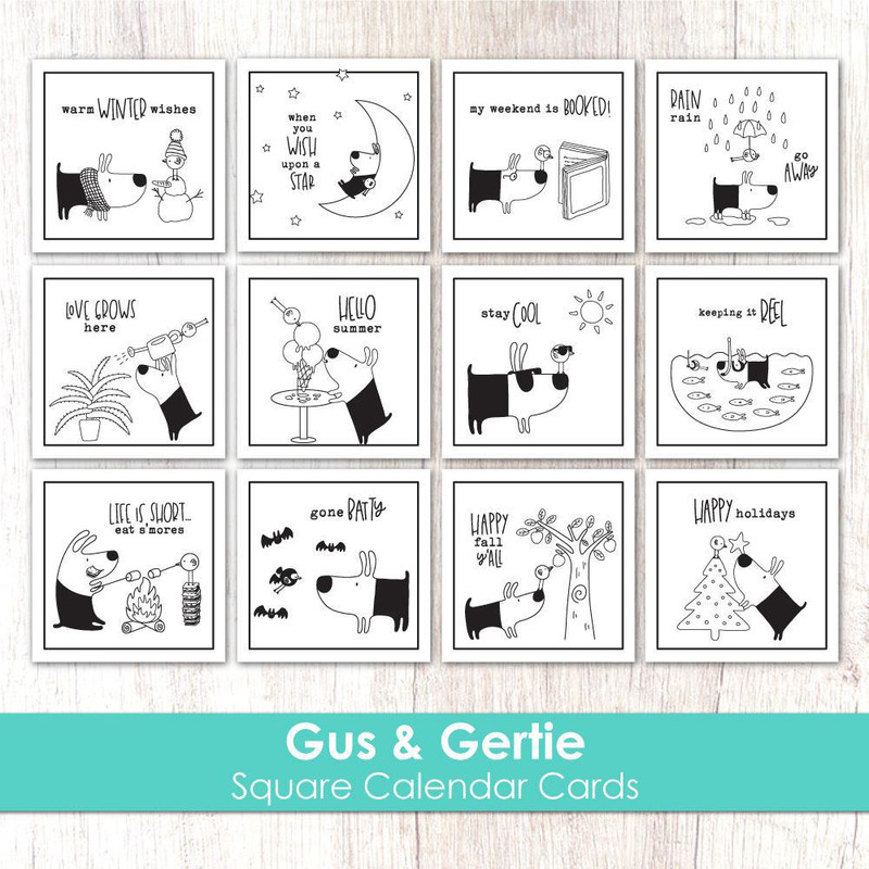 Sweeten up your calendars and cards with the Square Calendar Cards - Gus & Gertie set! Includes 12 individual cards printed on heavyweight white cardstock, each measuring 2.75" x 2.75". Designs are toner-printed and can be heat-foiled, colored with alcohol markers, or filled in using colored pencils with Gamsol. Featuring the delightful Gus & Gertie, card sentiments include: Warm Winter Wishes, When You Wish Upon A Star, My Weekend Is Booked! Rain Rain Go Away, Love Grows Here, Hello Summer, Stay Cool, Keeping It Reel, Life Is Short...eat S'mores, Gone Batty, Happy Fall Y'all, Happy Holidays. Coordinates with our Square Tear-Off Calendar Stacklets & our Landscape Desk Calendars (both sold separately).
