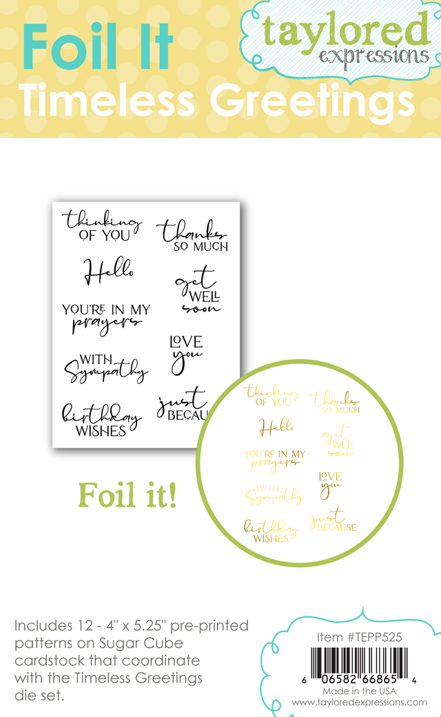 Dazzle your card recipients with Foil It - Timeless Greetings! This pack includes toner-printed panels filled with [design description] designs. Simply choose your favorite TE Fun Foil, place it over the panel, and run it through your heat source. The foil adheres to the toner-printed areas, making the design pop for an extra dose of sparkle in your creations! Pair with the Timeless Greetings Dies (sold separately) to cut out each sentiment. Sentiments include: Thinking of you, Hello, Thanks so much, Get well soon, You're in my prayers, Love you, With sympathy, Just because, Birthday wishes. Includes 12 pre-printed panels measuring 4 x 5 1/4 in. each. Printed on Sugar Cube cardstock. Coordinates with Timeless Greetings Dies (sold separately). Please note: Our Foil It products are designed to work with a Minc or laminator. They are not compatible with the Spellbinders Glimmer Machine (or other similar hot foiling tools). Previously offered during Summer School 2025.