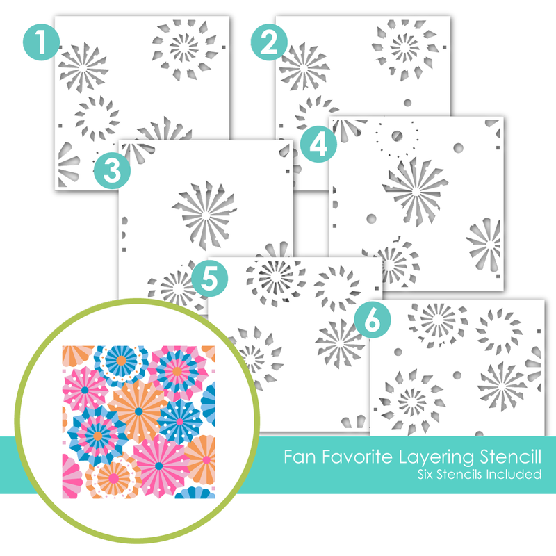 Add swirls of fun to your projects with the Fan Favorite Layering Stencil! This set of 6 stencils layers together to create a lively background filled with colorful paper fans. Use the convenient alignment squares included on each stencil layer to ensure your design lines up perfectly. Includes 6 stencils measuring 6 x 6 in. each.