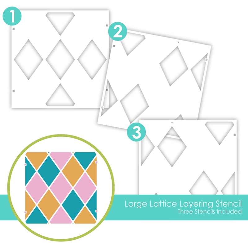 Bring your background to life with the Large Lattice Layering Stencil! This set of 3 stencils layer together to create colorful diamond shapes that are a perfect backdrop to use with A Year in Bloom stamps (2025 every order gift). Pair with the Large Lattice 6x6 Background Stamp (sold separately) to add crisp lines between each diamond or use on its own. The convenient alignment squares on each stencil layer make it easy to ensure your design lines up perfectly. Use with your favorite TE Premium Ink or try layering with other mediums like TE Happy Medium, Astro Paste, and more! Includes 3 stencils measuring 6 x 6 in. each. Coordinates with the Large Lattice 6x6 Background Stamp (sold separately).