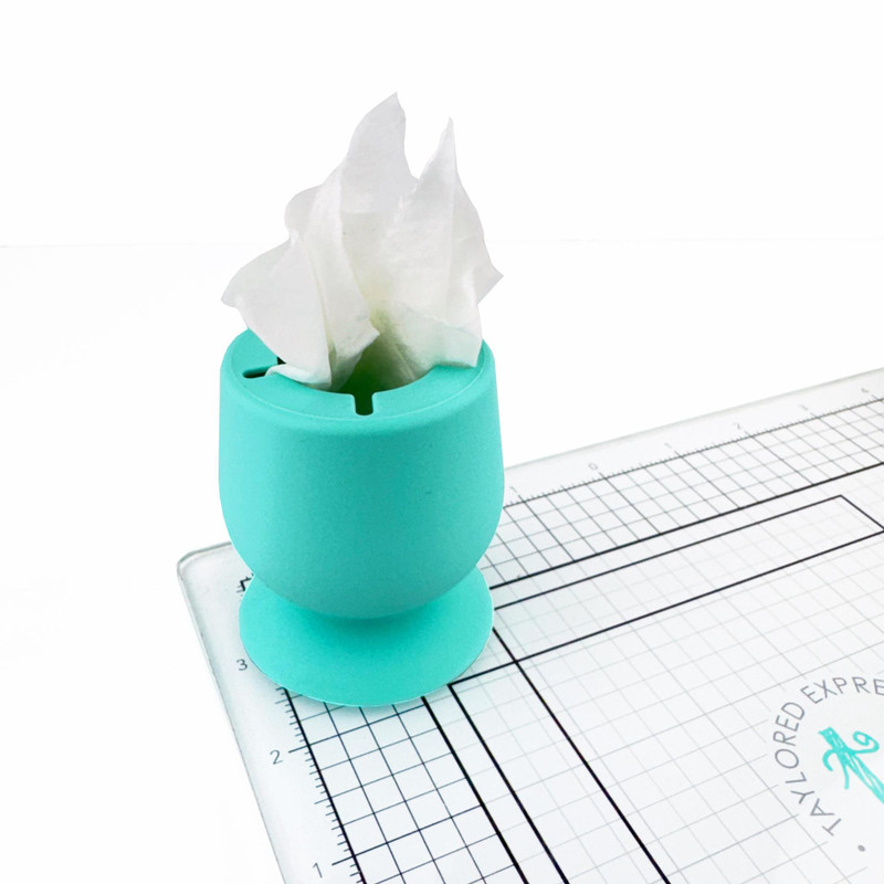 Say goodbye to the endless search for missing supplies with the Handy Holder! This clever little helper keeps all your crafty essentials - like glue bottles, die cuts, and any other bits & bobs - right where you need them. Perfect for holding baby wipes out of the way and keeping them from drying out between uses. This trusty tool will help keep your workspace tidy and your creativity flowing! Made of high quality teal silicone with a sturdy suction cup base. Cup measures 2 1/4 x 2 1/4 x 2 1/4 in.
