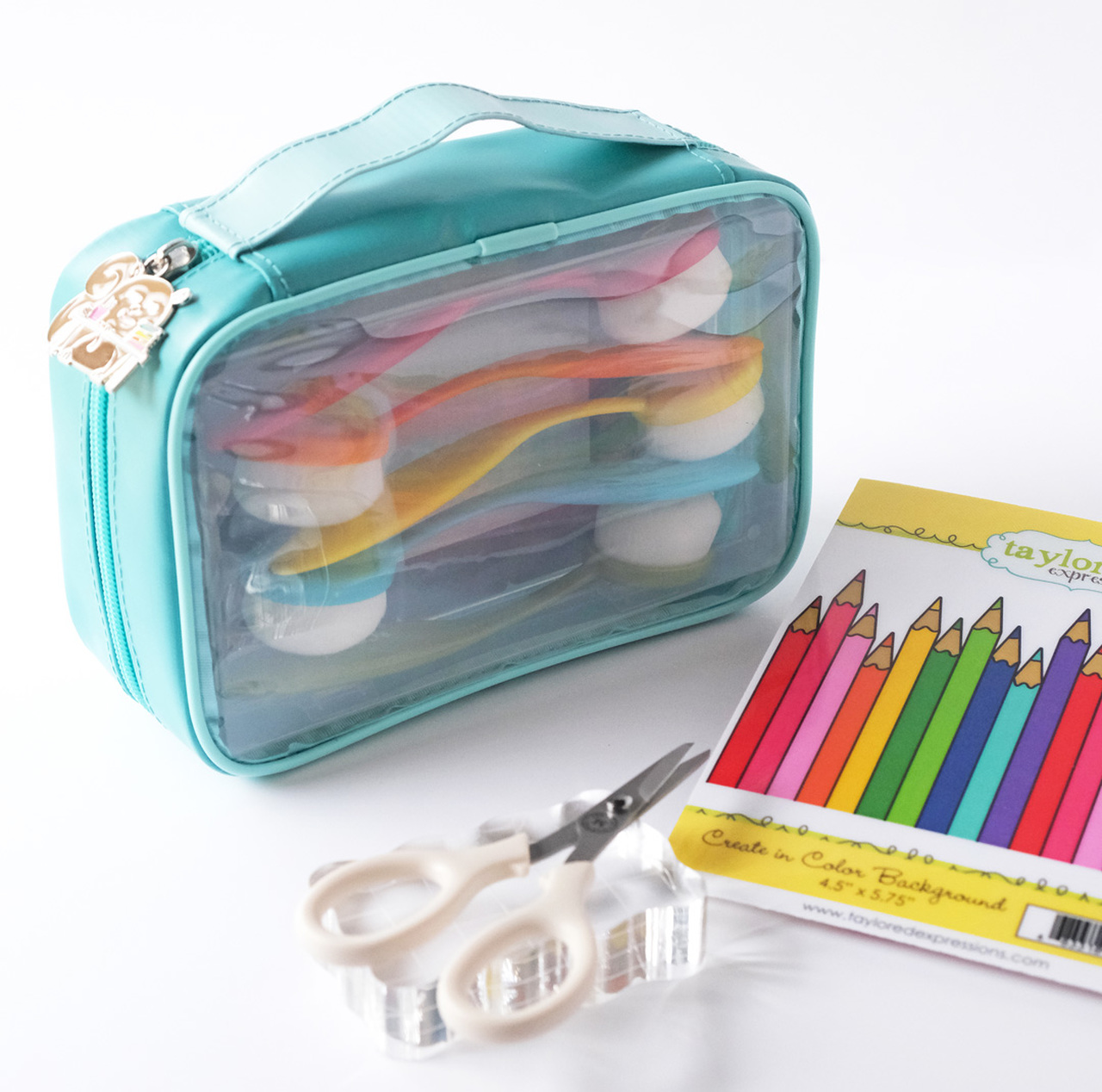 Take your Simple Storage cases to crops, classes or anywhere you craft with our fun and exclusive Tag Along Tote! The fabric tote comes with two Simple Storage cases and features clear vinyl sides so you can view the supplies inside. A handle and zipper that opens down the center makes the tote super convenient to carry your crafty stash, and the teal color and Crafty Grumpling zipper pull make it distinctly TE! Includes one tote (5.5" wide x 7.9" long x 2.5" high) and two Simple Storage cases.