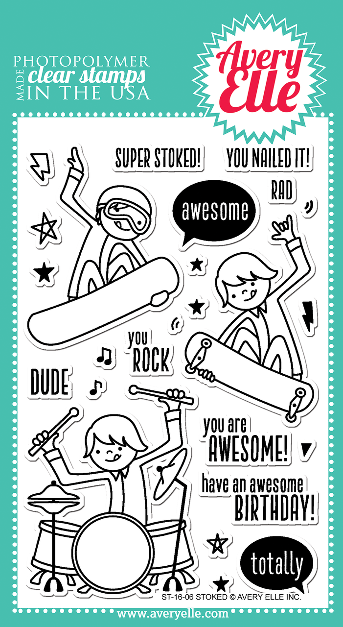 25 total stamps. Skateboarder stamp measures : 1 5/8" x 2 9/16"; Drummer stamp measures : 2 1/4" x 2 9/16"; Have an awesome birthday sentiment measures: 1 3/8" x 9/16".