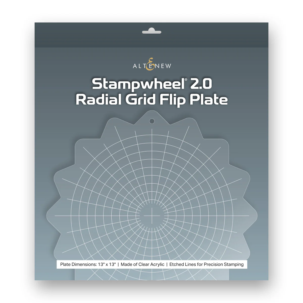 It's time to flip and rotate your way to perfect stamping! The Radial Grid Flip Plate fits snugly into the Stampwheel 2.0. Featuring concentric circles and evenly spaced etched lines radiating from the center, this plate creates a precise radial grid for effortless wreath building, layered stamping, sentiment alignment, and more. Simply mount your stamps, ink them up, and enjoy flawless results every time! Features: - Flip plate diameter: 13" x 13" - 32 etched lines radiating from the center point - Material: Clear acrylic - Hole at the top for hanging and guided rotation