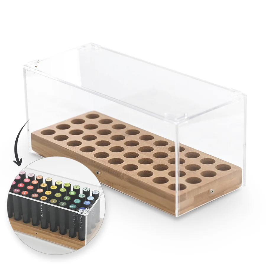 Say goodbye to clutter and hello to organization with Altenew's custom-designed Blending Brush Storage! Specifically crafted to perfectly fit your Altenew Mini Blending Brushes, this elegant storage solution combines functionality with style. The sleek bamboo base and clear acrylic sides ensure that your brushes are not only well-protected but also beautifully displayed, making it easy to find the perfect tool for your next masterpiece. Features: Custom Design: Tailored specifically for Altenew mini blending brushes, ensuring a perfect fit. Durable Bamboo Base: A sturdy foundation that adds a touch of elegance to your crafting space. Clear Acrylic Sides and Lid: Provides visibility while keeping your brushes dust-free and secure. Stackable Design: Add the lid for a stackable option, maximizing your storage potential. Holds Up to 40 Brushes: Ample space to store your entire collection, keeping everything organized and accessible. Dimensions: L: 8.75" x D: 4.25" x H: 4.0"; Diameter of holes: 5/8" Perfect for crafters of all levels, this storage solution will keep your workspace tidy and your brushes ready! How to Care: Before first use, remove the protective film from the acrylic sides and lid. To clean ink stains, gently wipe the bottom surface of the brush slot with an alcohol wipe. Avoid wiping the inner edges of the slots to maintain the material's integrity.