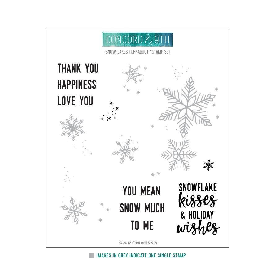 6x6 Turnabout with 9 additional images. The Snowflakes Turnabout creates a fun and festive multi-colored background with just one stamp, one jig, 1-4 ink colors, an Original MISTI and a few turns of your paper. In addition to the Turnabout, there are multiple sentiments that allow you to add a little something extra and make the perfect card. This design is more forgiving when stamped because the snowflakes overlap each other intentionally! Coordinates with Snow Flurry dies.
