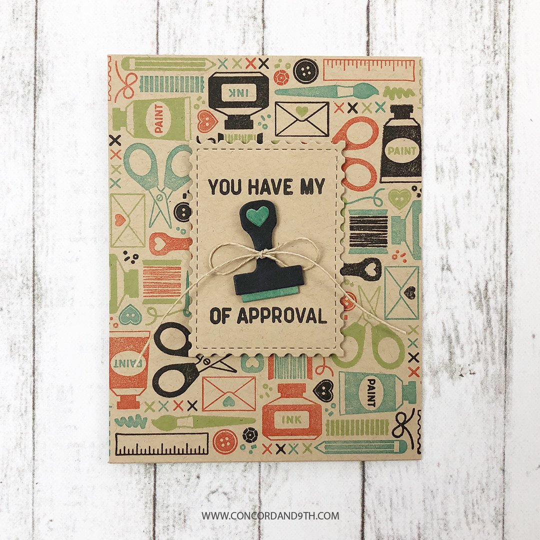 6x8 stamp set with 20 images! Coordinates with Crafty dies. The light gray image is the Turnabout section. In the Turnabout there are images that layer over each other. For example, the word PAINT ends up on the tube of paint, but in a different color when using 4 colors of ink. Same with the word INK on the ink bottle, thread on the needle, the squiggle of color by the paint brush, and the spool of twine. Build sentiments such as "you have my STAMP of approval", "we were CUT OUT to be friends", "your kindness brings so much COLOR to my life" and "love you SEW".