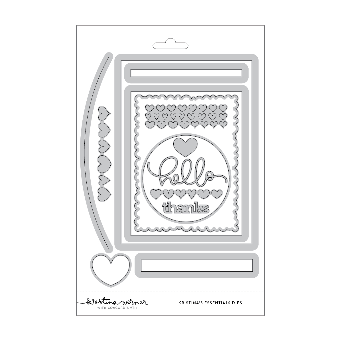 All of Kristina's most used dies in one set! Larger dies feature thicker metal edges to prevent warping of the dies when used. 14 pieces. Kristina's Essential Dies includes the following dies: "hello" greeting in Kristina's signature style, "thanks" in simple font, 5" x 7" (for A7 card fronts), 4.25" x 5.5" (for A2 card fronts), 3.3 circle, Curved edge, Wonky scalloped border (sized for A2 cards), 2 "sentiment strips", Hearts of various sizes