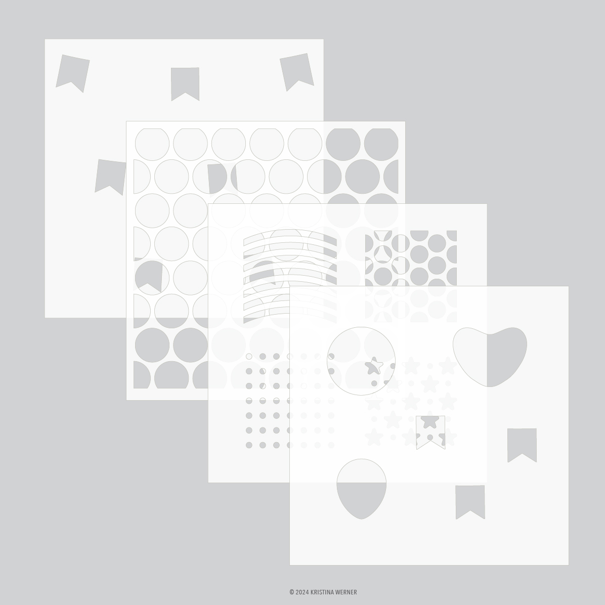 Add color and patterns with the Banner and Balloons Stencil Pack. This stencil pack contains four 6" x 6" stencils.