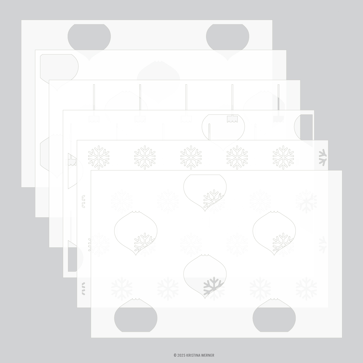 The Ornaments Stencil Pack Includes six layering stencils that make it simple to create a pattern of multi-colored ornaments. Plus, use the snowflake layer stencil to create an all snowflakes background! The extra-large 6x9 size allows you to create two A2 card fronts at once, making holiday crafting faster and more fun. Six 6x9 stencils.