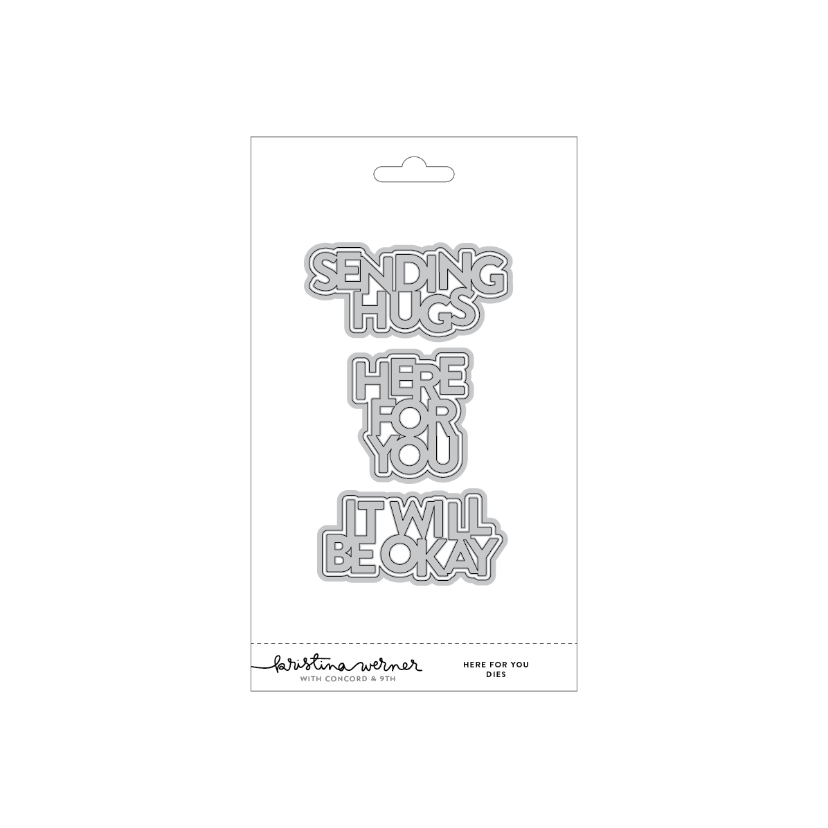 The Here For You Dies includes three sentiment dies - Sending Hugs, Here for You, and It Will Be Okay - each with a coordinating outline. Perfect for adding clean, bold greetings to encouragement and thinking-of-you cards. 6 pieces.