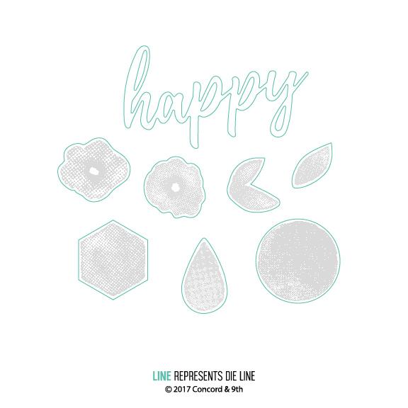 8 piece die set. Designed to coordinate with the Bits & Pieces stamp set. This dies set cuts the petal shape, flowers, leaves, circle & hexagon images in the stamp set, plus a scripty "happy". Approximate measurements: Happy = 2 3/4" x 1 5/8", Circle = 1 1/4", Hexagon = 1" x 1 3/16"