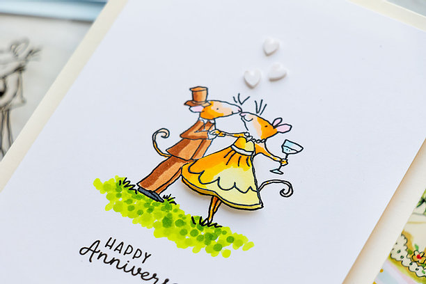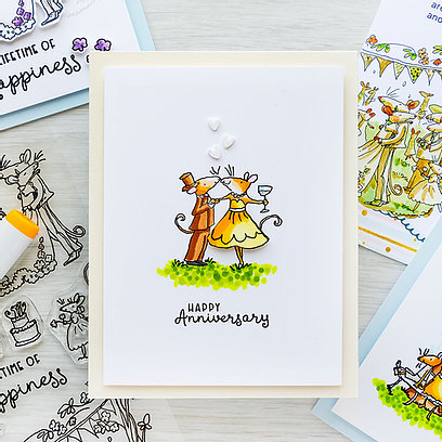Send anniversary wishes with the Anniversary Mini Clear Photopolymer Stamp Set featuring the illustrations of Anita Jeram for Colorado Craft Company. The set includes clear photopolymer stamps with an adorable mouse couple and a single gift. The stamps can be used with the coordinating Anniversary Mini die set sold separately. This stamp set measures 2" x 3". It includes 4 stamps, 2 images and 2 sentiments - "Happy Anniversary" and "Bravo!" . Approximate Dimensions: Largest: 1.6" x 1.75", Smallest: 0.5" x 0.5".