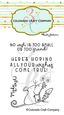 We hope all your wishes come true with the Make a Wish Mini Clear Photopolymer Stamp Set featuring the illustrations of Anita Jeram for Colorado Craft Company. The set includes clear photopolymer stamps with a mouse holding a dandelion. The stamps can be used with the coordinating Make a Wish Mini die set sold separately. This stamp set measures 2” x 3”. It includes 4 stamps: 1 image and 3 sentiments. Sentiments include: "No wish is too small or too grand!", "Here's hoping all your wishes come true!"and "Make a wish!". Approximate Dimensions: Largest: 1.75" x 1.25", Smallest: 1" x 0.4".