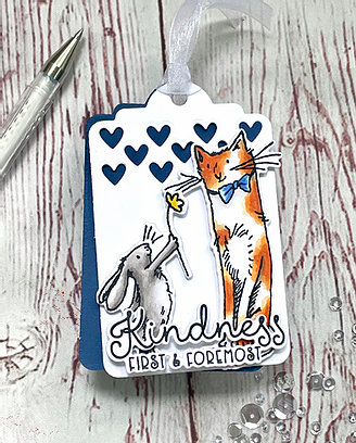Spread love and kindness to others with the Kindness First Clear Photopolymer Stamp Set featuring the illustrations of Anita Jeram for Colorado Craft Company. The set includes clear photopolymer stamps with a bunny holding a flower and a cat in a bowtie. The stamps can be used with the coordinating Kindness First die set sold separately. This stamp set measures 3" x 4". It includes 6 stamps, 2 images and 4 sentiments. Sentiments include: "Kindness first & foremost," "A token of my," "Love" and "For you." Approximate Dimensions: Largest: 2.8" x 1.5", Smallest: 1" x 0.25".