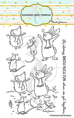 Friends make everything more fun with the Get Together Clear Photopolymer Stamp Set featuring the illustrations of Anita Jeram for Colorado Craft Company. The set includes clear photopolymer stamps with a hedgehog, a bunny and two mice playing together. The stamps can be used with the coordinating Get Together die set sold separately. This stamp set measures 4" x 6". It includes 6 stamps, 5 images and 1 sentiment. Sentiment: "It's always Snow Much Fun when we get together." Approximate Dimensions: Largest: 3.4" x 3.25", Smallest: 1.25" x 1.25".