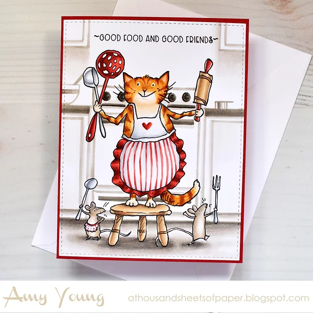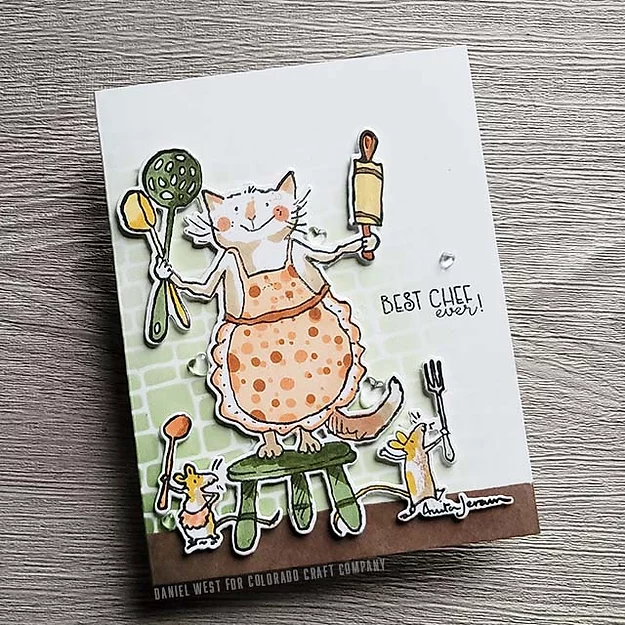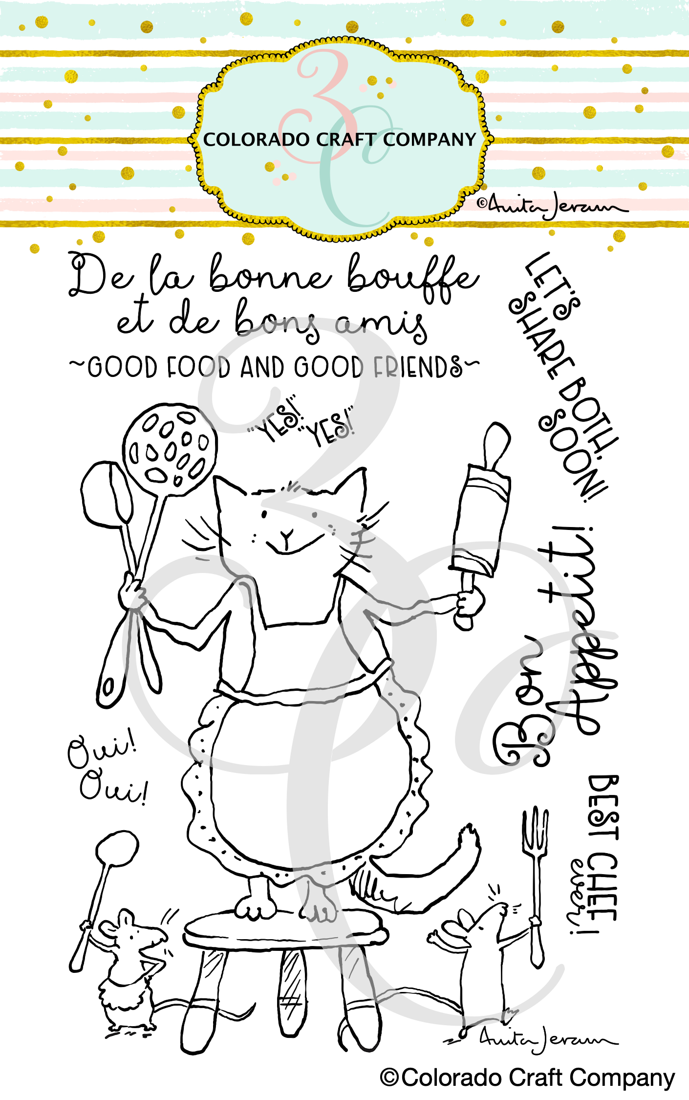 Let's get cooking with the Bon Appetit Clear Photopolymer Stamp Set featuring the illustrations of Anita Jeram for Colorado Craft Company. The set includes clear photopolymer stamps with a cat in an apron and two mice holding kitchen utensils. This 4.5 x 7.5-inch package includes the Bon Appetit stamp set measuring 4 x 6 inches. It includes 7 stamps, 1 image and 6 sentiments. The largest stamp is 3.3 x 4.5 inches and the smallest stamp is 0.75 x 0.5 inches. The stamps can be used with the coordinating Bon Appetit die set sold separately (AJ637-D). Sentiments included in the set: De la bonne bouffe et de bons amis, Good food and good friends, Let's share both soon, Bon Appetit, Oui Oui, Yes Yes, and Best chef ever!