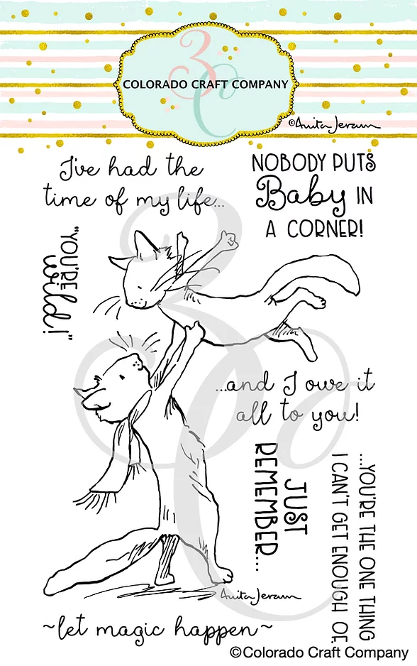 Let magic happen with the Time Of My Life Clear Photopolymer Stamp Set featuring the illustrations of Anita Jeram for Colorado Craft Company. The set includes clear photopolymer stamps with a cat lifting another cat over its head. The stamps can be used with the coordinating Time Of My Life die set sold separately (AJ661-D). This stamp set measures 4" x 6". It includes 8 stamps: 1 large image and 7 sentiments. Sentiments include: "I've had the time of my life", "Nobody puts Baby in the corner", "You're wild", "let magic happen", "Just remember", "...and I owe it all to you", and "You're the one thing I can't get enough of". Approximate Dimensions: Largest: 3.75" x 4.25", Smallest: 0.5" x 1.3"