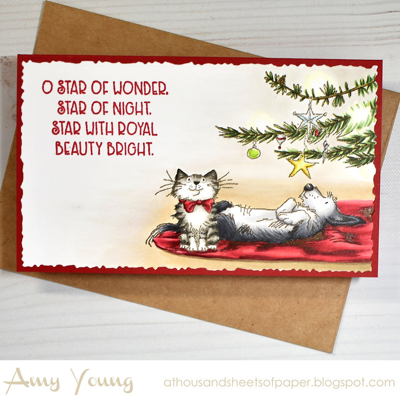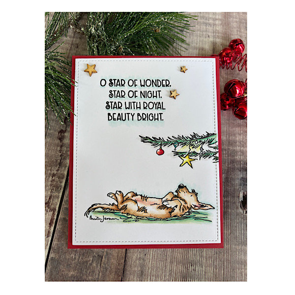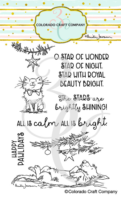 All is calm and bright with the All Is Bright Clear Photopolymer Stamp Set featuring the illustrations of Anita Jeram for Colorado Craft Company. The set includes clear photopolymer stamps with a kitten in a bowtie and a dog laying on its back. The set also includes a garland with a star hanging down and the bottom branches of a Christmas tree. The stamps can be used with the coordinating All Is Bright die set sold separately (AJ671-D). This stamp set measures 4" x 6". It includes 8 stamps: 4 images and 4 sentiments. Sentiments included in the set: "The stars are brightly shining", "All is calm all is bright", "Happy Pawlidays", and "O star of wonder, star of night, star of royal, beauty bright." Approximate Dimensions: Largest: 3.75" x 1", Smallest: 1.25" x 0.5"
