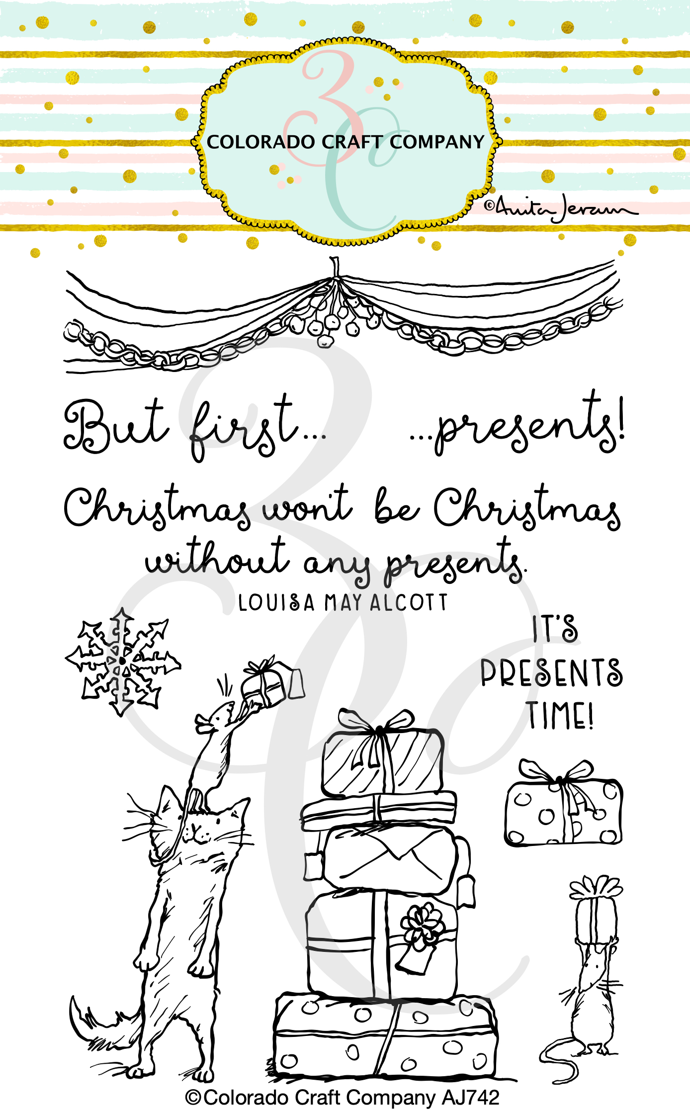 Time to open some fun with the But First Presents Clear Photopolymer Stamp Set featuring the illustrations of Anita Jeram for Colorado Craft Company. The set includes clear photopolymer stamps with a stack of presents, a mouse holding a gift, a cat and mouse reaching up to add a gift to the stack of presents, a snowflake, a gift and a garland with mistletoe. This 4.5 x 7.5-inch package includes the But First Presents stamp set measuring 4 x 6 inches. It includes 10 stamps: 6 images and 4 sentiments. The largest stamp is 1.6 x 2.5 inches and the smallest stamp is 0.75 x 0.75 inches. The stamps can be used with the coordinating But First Presents die set sold separately (AJ743-D). Sentiments included in the set: But first..., presents, It's present time, and a quote by Louisa May Alcott: Christmas won't be Christmas without any presents.