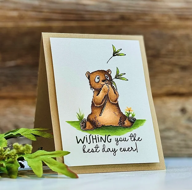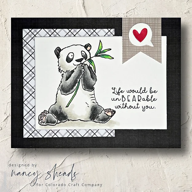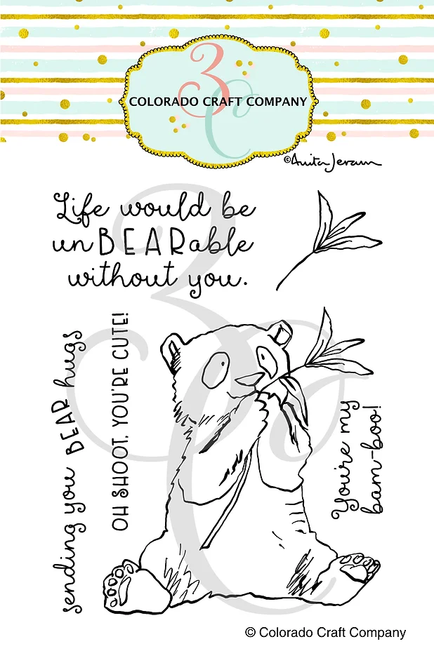 Welcome a new sweet animal to the family with the Bear Hugs Clear Photopolymer Stamp Set featuring the illustrations of Anita Jeram for Colorado Craft Company. The set includes clear photopolymer stamps with a panda bear holding bamboo. This 3.625 x 5.5-inch package includes the Bear Hugs stamp set measuring 3 x 4 inches. The largest stamp is 2.3 x 2.6 inches and the smallest stamp is 0.4 x 1 inches. The stamps can be used with the coordinating Bear Hugs die set sold separately (AJ949-D). It includes six stamps: two images and four sentiments. Sentiments included in the set: You're my bam-boo! Sending you bear hugs, oh shoot, you're cute! Life would be unbearable without you. Approximate Dimensions: Largest: 2.3" x 2.6", Smallest: 0.4" x 1"