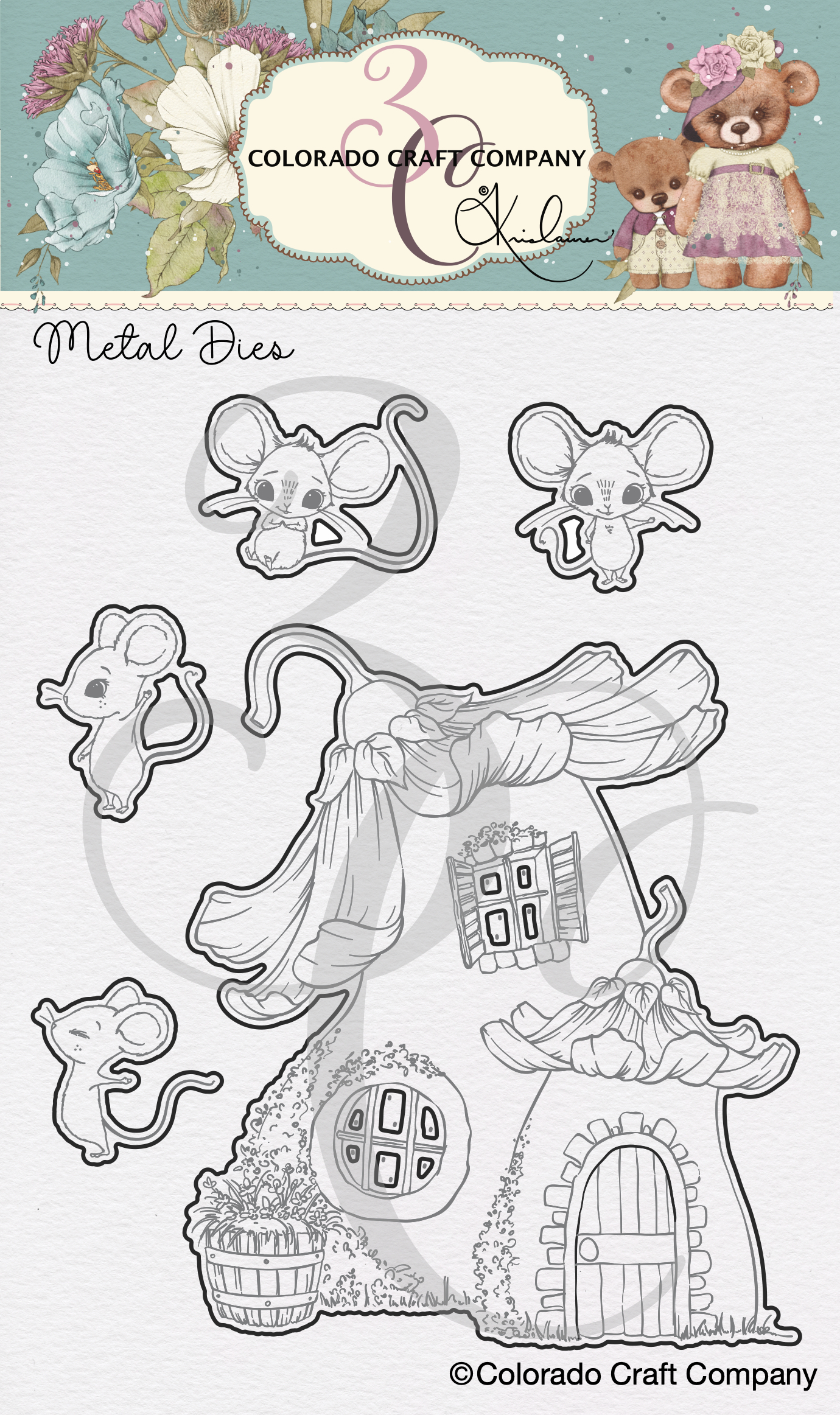 Cozy up with the Mouse House Dies featuring the illustrations of Kris Lauren for Colorado Craft Company! The 6.5 x 7-inch package includes 6 thin metal dies that are compatible with most die cutting machines and coordinate with the Mouse House stamp set (KL602 - sold separately). The largest die is 4 x 3.5 inches and the smallest die is 1 x 1.25 inches. Dies include a whimsical garden house with a separate cut out for the door and four tiny mice.