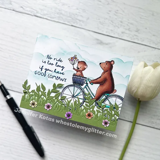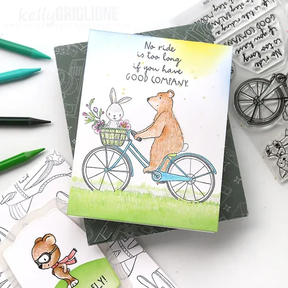 Take a ride with the Good Company Clear Photopolymer Stamp Set featuring the illustrations of Kris Lauren for Colorado Craft Company. The set includes clear photopolymer stamps with a bear, a bicycle with a basket, a bunny, a fox, four flowers and a bear cub. This package includes the Good Company stamp set measuring 4 x 6 inches. The stamps can be used with the coordinating Good Company die set sold separately (KL869-D). It includes ten stamps: eight images and two sentiments. Sentiments included in the set: "No ride is too long if you have good company!" "Life is like riding a bicycle, to stay balanced you must stay moving!". Approximate measurements: Largest: 3.75 x 3.2 inches, Smallest: 0.4 x 0.4 inches