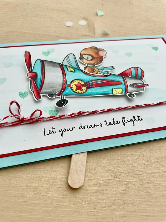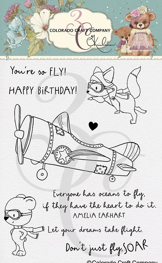 The perfect set for an aviation fan is here with the Oceans to Fly Clear Photopolymer Stamp Set featuring the illustrations of Kris Lauren for Colorado Craft Company. The set includes clear photopolymer stamps with an airplane, a heart, and a bear and a fox both with goggles. This package includes the Oceans to Fly stamp set measuring 4 x 6 inches. The stamps can be used with the coordinating Oceans to Fly die set sold separately (KL871-D). It includes nine stamps: four images and five sentiments. Sentiments included in the set: "Everyone has oceans to fly, if they have the heart to do it. Amelia Earhart" "Happy Birthday" "You're so fly!" "Let your dreams take flight." "Don't just fly, soar". Approximate Measurements: Largest: 3.2" x 1.7", Smallest: .2" x .2"