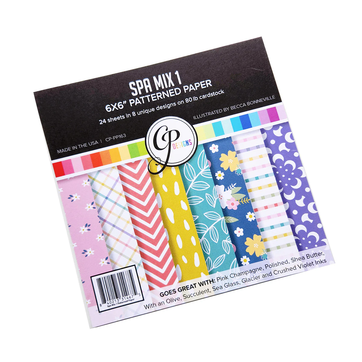 Grab a versatile paper pack for everyday use! Spa Mix 1 Patterned Paper was created to coordinate with our Spa Mix 1 Minis Box Set. Featuring floral prints and pretty patterns this pack has the color combo of: Pink Champagne, Polished, Shea Butter, With an Olive, Succulent, Sea Glass, Glacier and Crushed Violet Inks. You'll get three (3) sheets of each of the eight (8) different designs. Illustrated by Becca Bonneville. Catherine Pooler Designs patterned paper is 6" x 6" in size, single sided, made from 80# cardstock and printed in the USA.