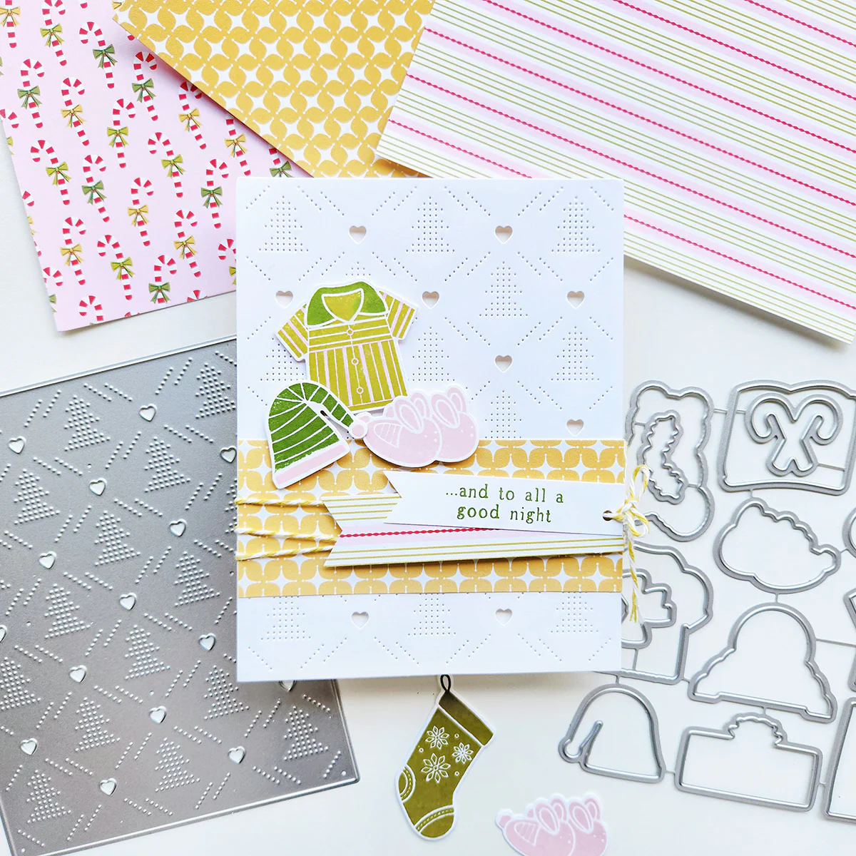 Bring the nostalgia of a handmade holiday to your projects with the Christmas Embroidery Cover Plate Die. Featuring a stitched-inspired pattern of Christmas trees and hearts, this design evokes the charm of a treasured gift from grandma. Perfect for adding gorgeous texture and detail, this cover plate is a beautiful backdrop on its own or enhanced with techniques. Try ink blending over the design for a festive pop of color, or inlay a few of the hearts for an extra-special touch. The Christmas Embroidery Cover Plate Die measures 4 1/4 x 5 1/2" and will cover an A2 size card. Illustrated by Lisa Kirkbride. Stainless steel and are compatible with all standard die cutting machines.