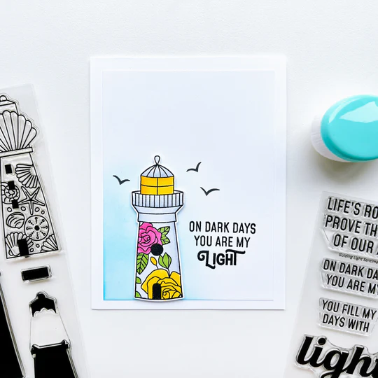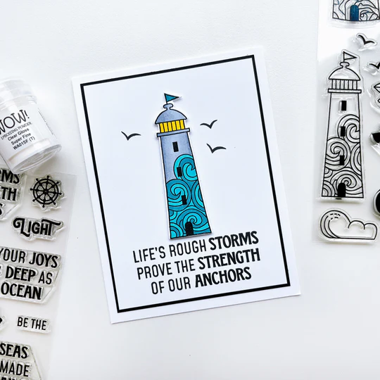 The Guiding Light Sentiments Stamp Set is packed with encouraging sentiments that mix and match with the "light" word stamps and the Light Word Die. This set also includes small nautical icons, such as a ship's wheel and compass, to stamp with the sentiments. Sentiments include: Life's rough storms prove the strength of our anchors, On dark days you are my, You fill my days with, Light, May your joys be as deep as the ocean, Calm seas never made skilled sailors, Be the, Sending comfort love and , Shine your, Will guide you home. Get the coordinating Guiding Light Dies for more arrangement options. Designed by Lacey Gasper