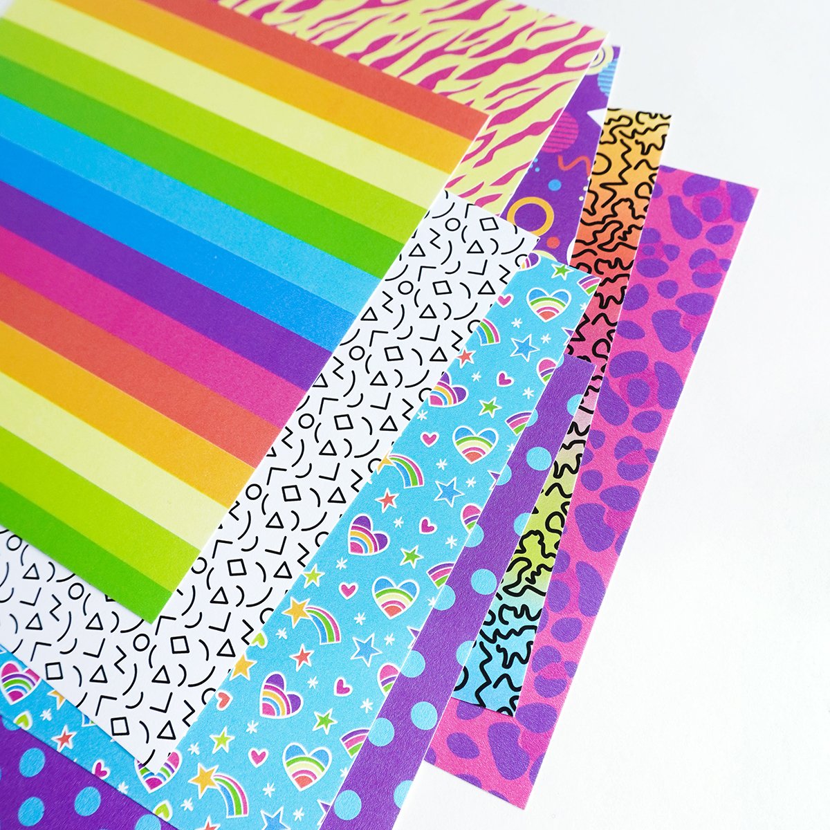 Inspired by 80's pop culture, the Totally Rad Patterned Paper has got it all! Starting with a bright rainbow color palette this pack is loaded with geo-patterns and animal prints. A strip of the rainbow striped sheet, or Grape Crush and Fiesta Blue polka dot will be the perfect pairing with the images in the Totally Rad Bundle. Coordinates with ink colors: Be Mine, Limoncello, Tiki Torch, Lime Rickey, Grass Skirt, Something Borrowed, and Grape Crush. You'll get three (3) sheets of each of the eight (8) different designs containing stripes, stars, rainbows, animal, geometric, spots and squiggles.