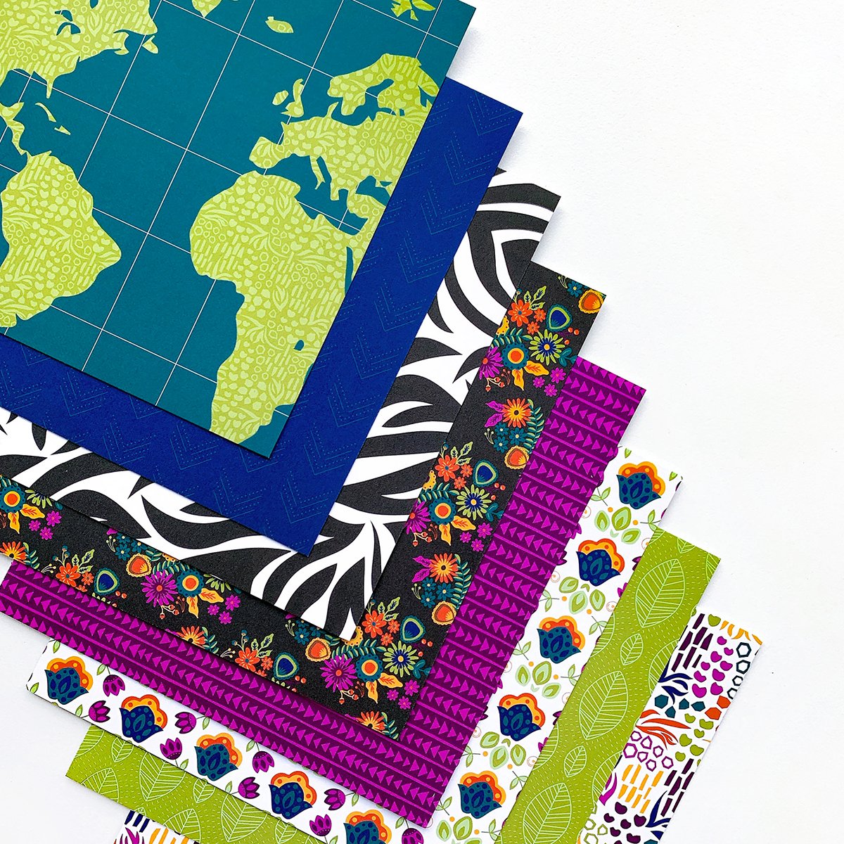 Featuring some of the Luxe Inks is the Across the Globe Patterned Paper. This pack of globally inspired patterns and prints are inspired by textiles and art found around the world. From the zebra stripes to the folk florals, this pack has a pop of pizzaz for everyone. This paper pack coordinates with Flame, Glitz, Martini, Uptown, Dress Blues, and Glam inks. Don't forget the Park Avenue Sequins! You'll get three (3) sheets of each of the eight (8) different designs. Illustrated by Traci Reed. Catherine Pooler Designs patterned paper is 6" x 6" in size, single sided, made from 80# cardstock and printed in the USA.