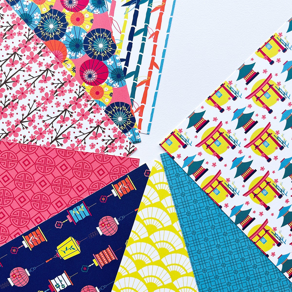 Traditional prints and patterns meet a modern and classy color scheme on in the Parasols & Pagodas Patterned Paper. This pack coordinates with Rouge, Polished, Mandarin Spice, Flame, Lemongrass, Bay Breeze, Skylight and Juniper Mist. With images inspired by the art and architecture of Asia, along with cherry blossoms and bamboo, this pack has it all! Don't forget the Kyoto Sequins for a bit of added glimmer!. You'll get three (3) sheets of each of the eight (8) different designs. Illustrated by Becca Bonneville.