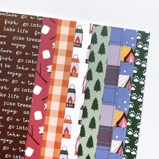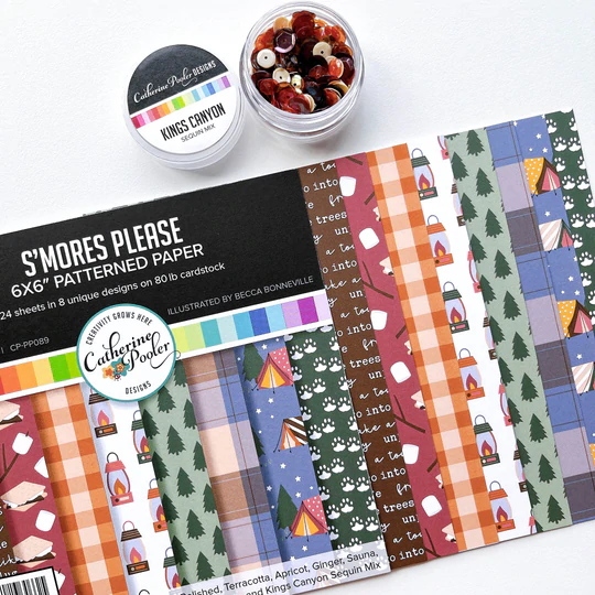 Let's venture into the wild for a touch of nature with the S'mores Please Patterned Paper pack! This pack of 6x6 paper features 8 patterns and prints inspired by camping in the great outdoors. Trees, animal tracks, and lanterns pair with plaids and a fun s'more print for a pack that you are going to love. This pack will also be great for father's day or masculine cards and features a Spa Color Combo of Polished, Terracotta, Apricot, Ginger, Sauna, Sage, Spruce, Cove Blue and Icing on the Cake. The Kings Canyon Sequin Mix was created to pair with this pack. You'll get three (3) sheets of each of the eight (8) different designs. Illustrated by Becca Bonneville