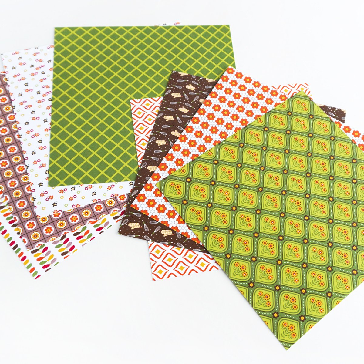 When we put together the Potluck Party Paper, we wanted to mimic the feel of kitchen floors, wallpaper and curtains from the 1970's. We chose a color palette of Spa Inks that felt like the right throwback to time. Anyone else have memories of avocado appliances or orange vinyl flooring? The Potluck Party Patterned Paper pack will add a 1970s Kitchen feel to your hand made cards, tags and scrapbook pages. Coordinates with ink colors: Rouge, Mandarin Spice, Sauna, Green Tea, Eucalyptus, Icing on the Cake, and Over Coffee. You'll get three (3) sheets of each of the eight (8) different designs containing flowers, geometrics, and whisks & mitts. Illustrated by Becca Bonneville