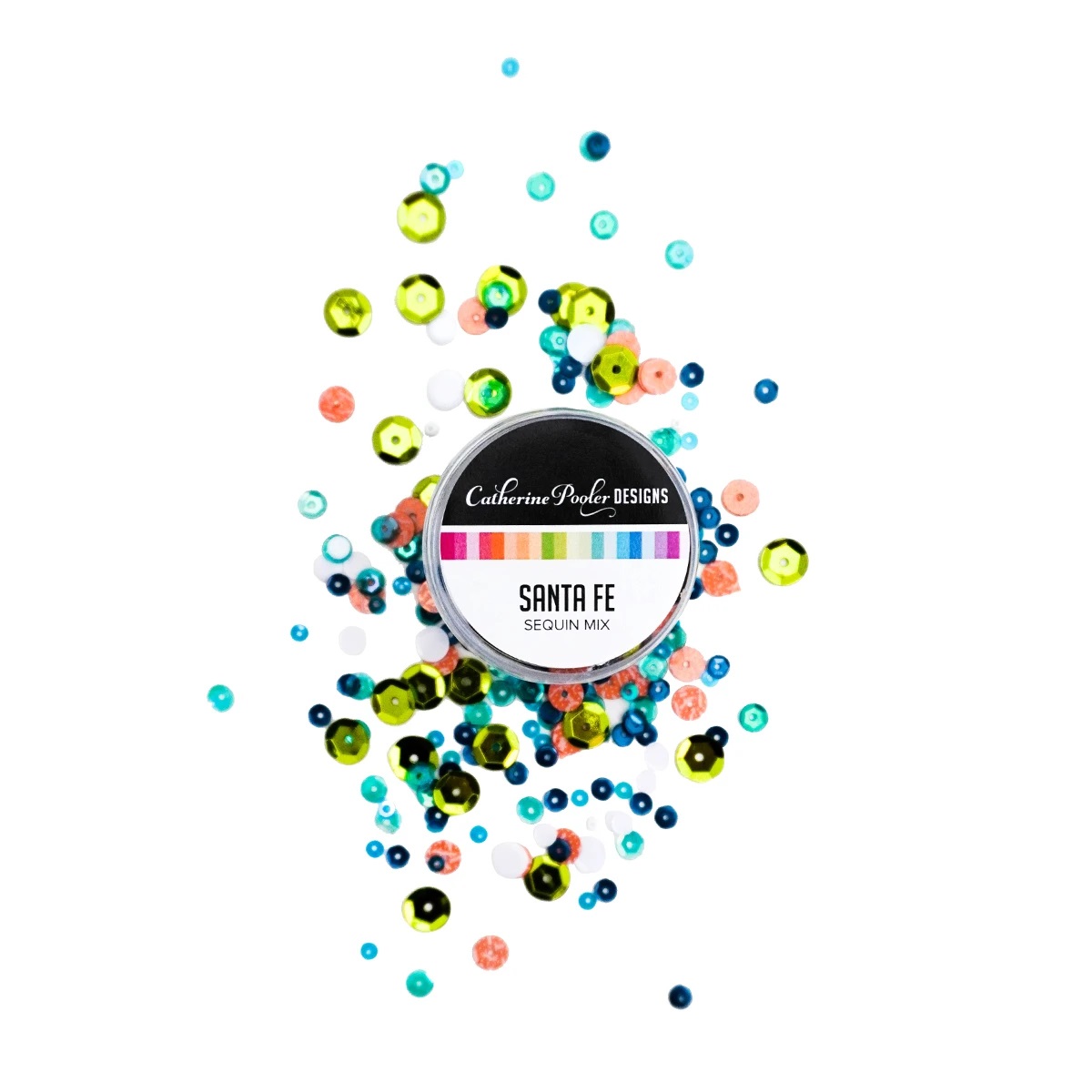 Add an Out West Touch to your projects with the Santa Fe sequin mix! Approximately 1 Tablespoon mixture of metallic kelly green, cupped navy, transparent dark ocean, hologram peach confetti, white glossy confetti iridescent jasper and white seed beads.. Packaged in a clear screw top round container.