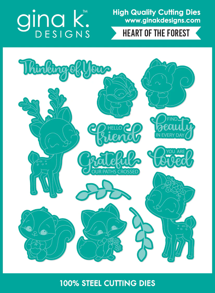 Gina K Designs wafer thin metal-etched dies are the highest quality available for your paper crafting projects. Our dies are compatible with most die-cutting machines. Follow the manufacturer's instructions for your specific machine for cutting wafer-thin dies. Dies are already cut apart. Gina K Designs dies are lead-free and non-toxic. Made in China. The Heart of the Forest Die set coordinates with the Heart of the Forest Stamp Set.
