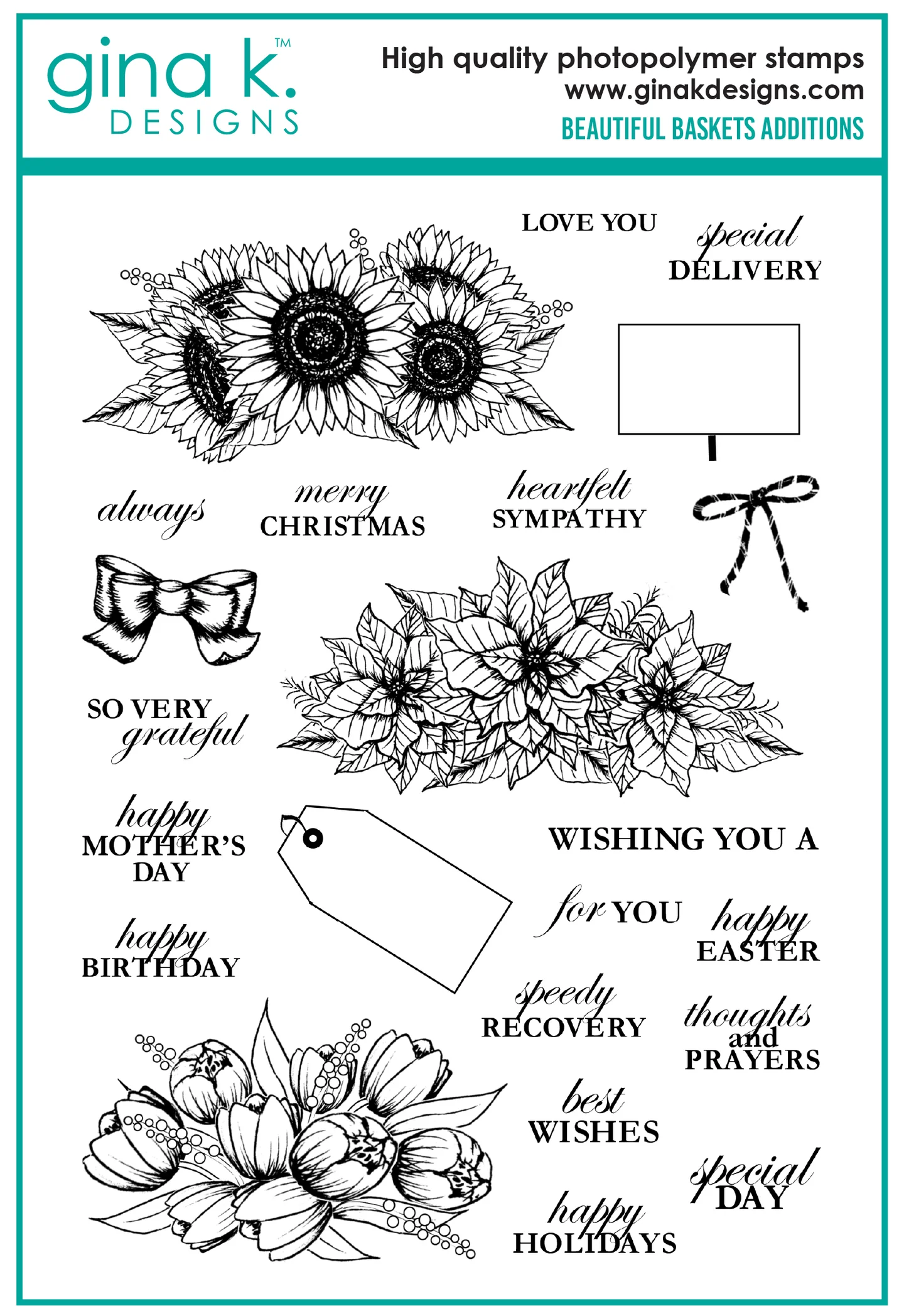 The newest set in Melanie Muenchinger's realistic Beautiful series is here! Beautiful Basket Additions has three gorgeous hand drawn floral arrangements that are perfect toppers for her Beautiful Baskets, but also wonderful stand alone elements for creating borders, frames and so much more! These versatile sentiments, tags and bows, tulips, sunflowers and poinsettias will stay on your desk year round for cards for all seasons and occasions. Seven images and 16 greetings for a total of 23 stamps. Largest images measure approximately 2x4" and fit on a 4 inch block. Coordinating set of 7 dies available. Beautiful Basket Additons is a stamp set by Gina K Designs. This set is made of premium clear photopolymer and measures 6" X 8". Made in the USA. Coordinating die set sold separately.