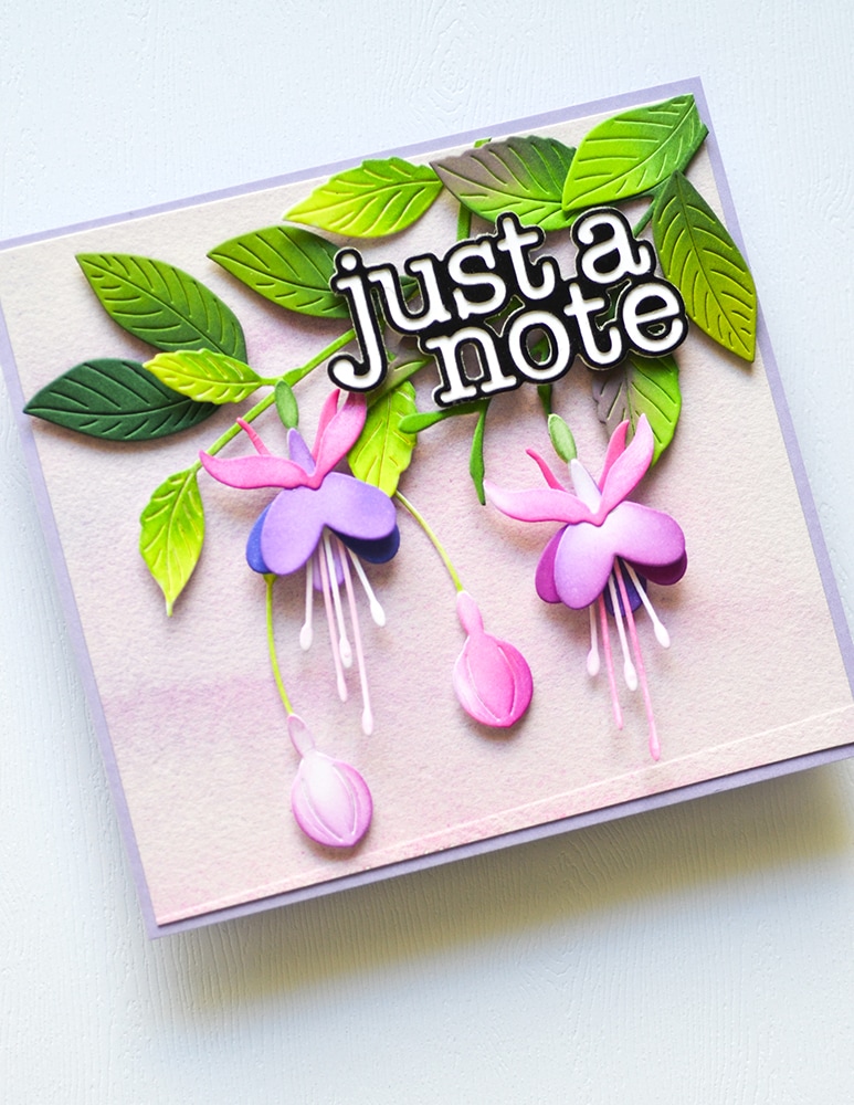 1.2 x 3.8, 0.5 x 2 inches fuchsias assembled, 4.3 x 1.9 inches branch. 3 x 9.7, 1.3 x 5.1 centimeters fuchsias assembled, 10.9 x 4.8 centimeters branch. 1 die included, cuts out 12 designs.