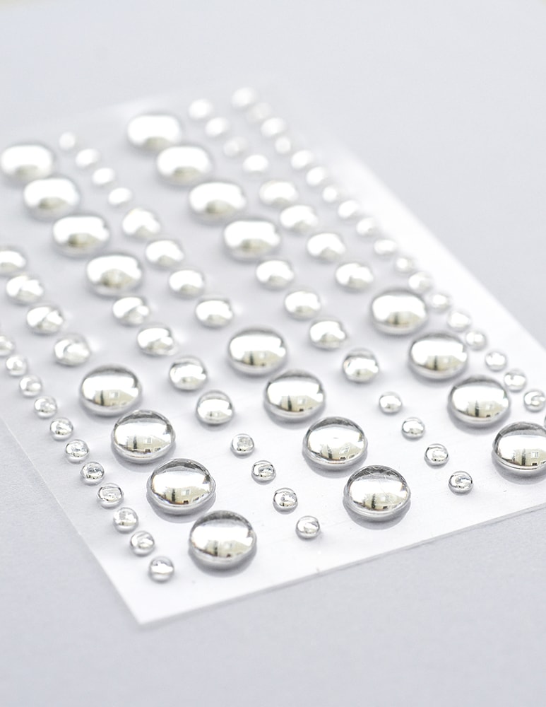 100 clear round drops for subtle embellishment. These self-adhesive drops range in size from 3 mm to 8 mm.