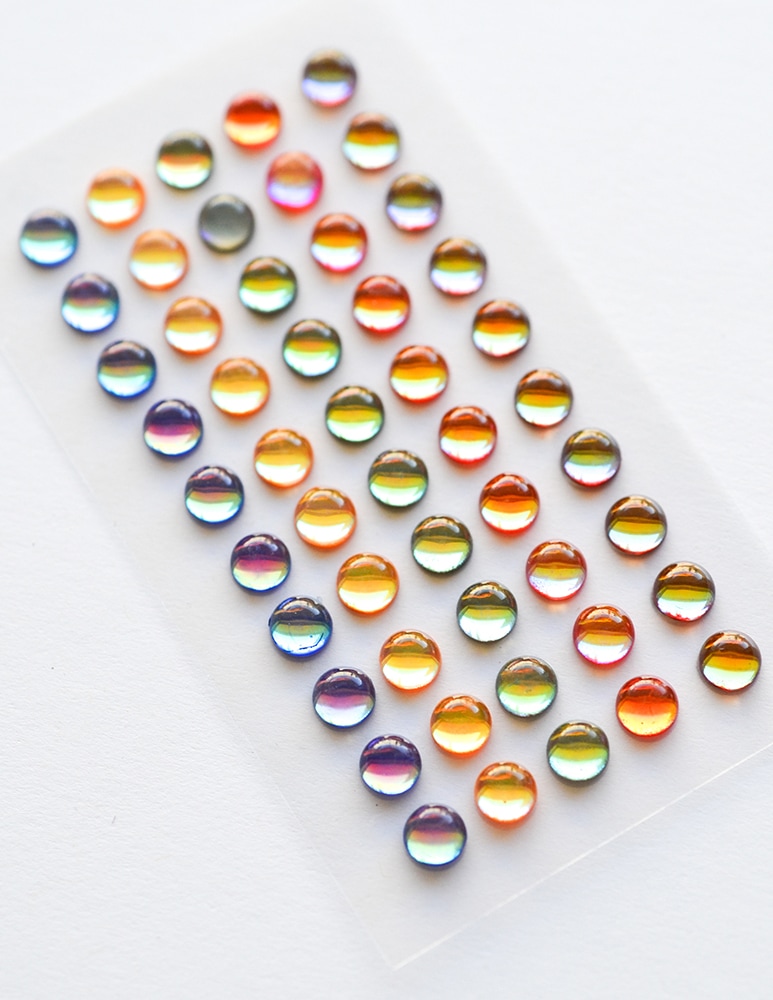 50 self adhesive drops in 5 iridescent colors. 5 mm diameter size for shiny accents