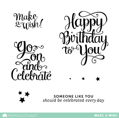 4x6 Photopolymer Stamp Set:Contains 8 Stamps: 4 sentiments and 4 imagesApproximate measurements: Happy Birthday 2-3/4" x 3-1/4",Go on and Celebrate 2-1/4" x 2-3/10",Make a Wish 1-3/4" x 1-1/16"