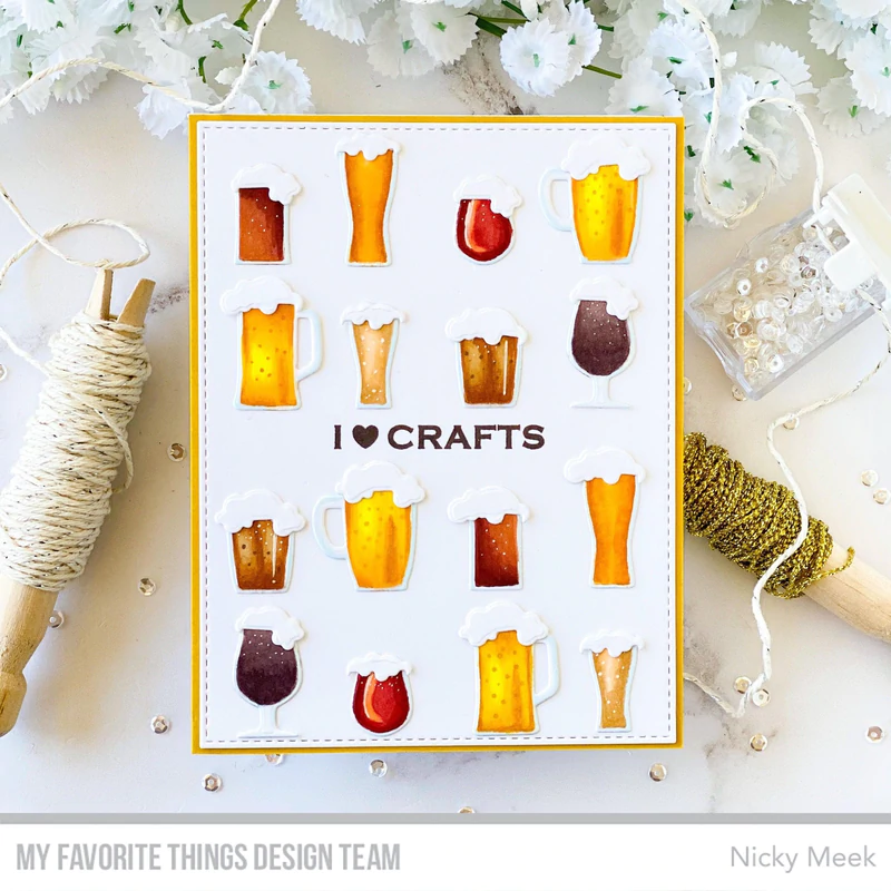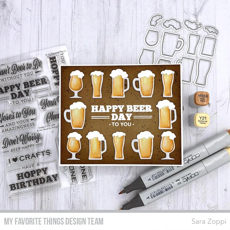 Raise a toast to the ones that make you hoppy! This punny assortment of pub-inspired sentiments will quickly become the one you reach for to celebrate, commiserate, elevate, and exhilarate. A mix of fonts keeps things fresh enough to stand alone or in support of the foamy fabulousness of the Frosty Beer Mug, or Pint Sized die sets. Cheers to you and all the amazing creations in your future! Our clear stamps are made in the USA and include the name of the set on the sticker for easy identification. 4" x 6" clear stamp set - (11) piece set. I Can't Beer to Be without You 2 3/8" x 5/8", Happy Beer Day to You 2 1/2" x 7/8", Here's to You and Your Amazingness 1 3/4" x 7/8", Don't Worry, Beer Happy 1 3/4" x 5/8", I Crafts 1 3/4" x 1/4", Have a Hoppy Birthday 2 1/8" x 1 1/8", You Make Me Hoppy 1 1/2" x 5/8", I Miss Your Mug 1 1/2" x 5/8", Cheers 7/8" x 3/8", Every Hour with You Is a Hoppy One 2 3/4" x 3/8", I Owe You One (or Several) 2 5/8" x 3/8".