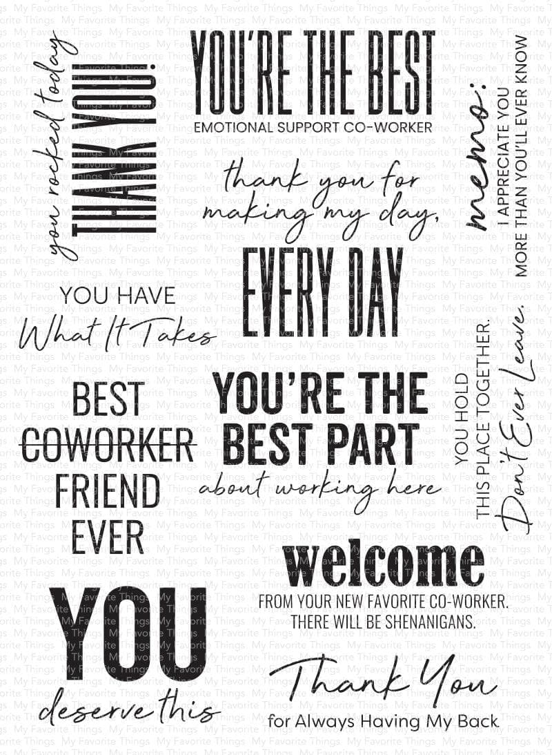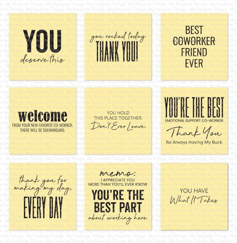 For a fast and simple card that packs a punch, why not pair Sticky Note Sentiments with the Sticky Note die set to craft a quick accent to "pin" to a card front? The assortment of phrases and greetings is a fantastic choice for recognizing co-workers, bosses, students, and more! With a variety of styles and fonts represented, you're sure to have the perfect option for everyone on your list. Our clear stamps are made in the USA and include the name of the set on the sticker for easy identification. April 2023 Release - 6" x 8" clear stamp set - (11) piece set. You Rocked Today Thank You! 2 1/2" x 1 3/8", You Have What It Takes 2 1/8" x 3/4", You're the Best Emotional Support Co-worker 2 5/8" x 1 1/8", Thank you for Making My Day, Every Day 2 1/2" x 2", Memo: I Appreciate You More than You'll Ever Know 2 5/8" x 5/8", Best Coworker Friend Ever 1 7/8" x 1 7/8", You're the Best Part about Working Here 2 5/8" x 1 1/2", You Hold This Place Together. Don't Ever Leave. 2 1/2" x 7/8", You Deserve This 2" x 1 1/2", Welcome from Your New Favorite Co-worker. There Will Be Shenanigans. 2 5/8" x 1", Thank You for Always Having My Back 2 1/2" x 7/8"