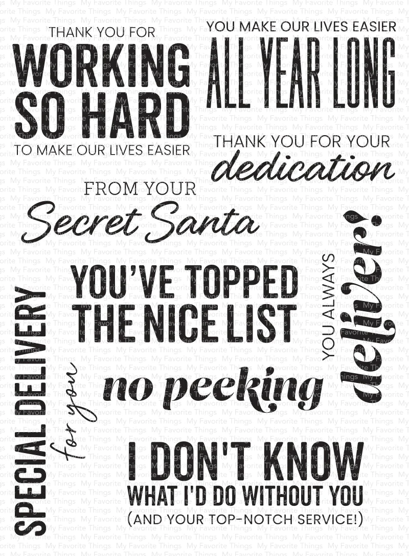 What would we do without our teachers, postal workers, hairdressers, coworkers, delivery drivers, sanitation workers, and more? Our lives would be a lot more difficult without their dedication and reliability. Show them you appreciate their efforts and recognize the difference they make in your life with this set of sentiments that let them know they make your life easier all year long. Designed to coordinate with the Money Card die, this set is perfect for coordinating with a cash or card gift. Our clear stamps are made in the USA and include the name of the set on the sticker for easy identification. October 2023 Release - 6" x 8" clear stamp set - (9) piece set. Thank You for Working So Hard to Make Our Lives Easier 2 5/8" x 1 7/8", You Make Our Lives Easier All Year Long 2 3/4" x 1 1/4", Thank You for Your Dedication 2 3/4" x 5/8", From Your Secret Santa 3 1/2" x 7/8", Special Delivery for You 3 5/8" x 1 1/4", You've Topped the Nice List 3 3/8" x 1 1/8", No Peeking 3 1/4" x 3/4", I Don't Know What I'd Do without You (and Your Top-Notch Service!) 3 3/8" x 1 1/4", You Always Deliver! 2 7/8" x 1 1/8".