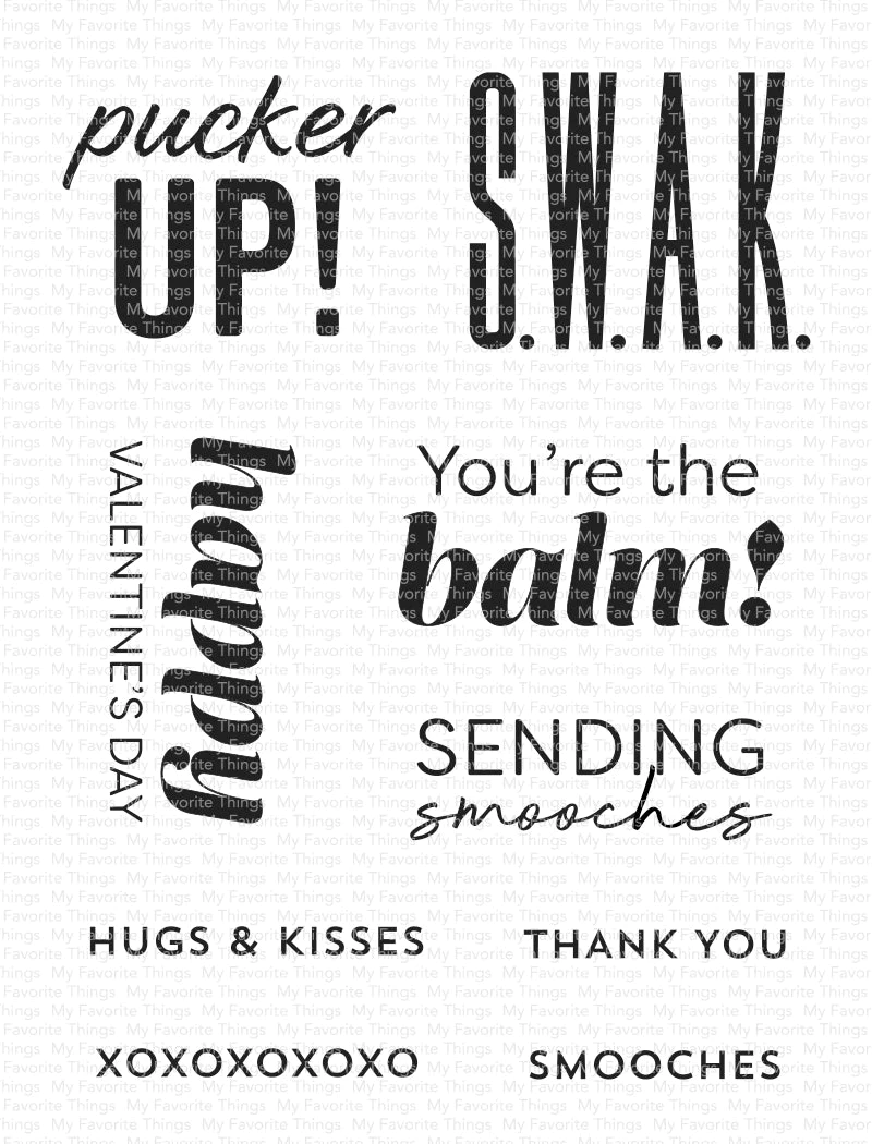 This endearing little stamp set features a collection of sentiments that will enhance cards, tags, and favors you create with the Lip Balm Window & Frame die set and Lip Balm Pouches. Every card and gift is an act of love; this set perfectly encapsulates that feeling in sentiment form! From sassy to sweet, Smooches has you covered. Our clear stamps are made in the USA and include the name of the set on the sticker for easy identification. January 2024 Release - 3" x 4" clear stamp set - (9) piece set. Pucker Up! 1 1/8" x 7/8", S.W.A.K. 1 1/8" x 1", Happy Valentine's Day 1 3/8" x 5/8", You're the Balm! 1 3/8" x 5/8", Sending Smooches 1 1/4" x 5/8", Hugs & Kisses 1 1/8", Thank You 7/8", XOXOXOXOXO 1 1/8", Smooches 7/8"
