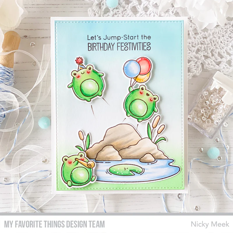 Celebrate those that make you hoppy with this adorable assortment of lily pad-loving leapers. Six silly frogs featuring party hats, balloons, birthday treats, and more are simply irresistible with their round little bodies and cheer-filled expressions. The perfect scene for a pond party features a cozy little nook with cattails and boulders to provide a safe spot to gather. Ready to jump-start the festivities? Add Hoppin' Good Time to your stash today! Our clear stamps are made in the USA and include the name of the set on the sticker for easy identification. April 2024 Release - 4" x 8" clear stamp set - (13) piece set. Sentiments: Let's Jump-Start the Birthday Festivities, Hop Hop Hooray It's Your Birthday, Hoppy Birthday, May Your Day Be Ribbiting, You Make Me Hoppy, When I'm with You, I Have a Hoppin' Good Time. Party hat frogs (2) 1 1/8" x 1 1/4", 1 1/8" x 1 3/8", Party horn from 1 1/8" x 1", Cake frog 1 1/4" x 1 1/8", Gift frog 1" x 1", Balloon frog 1 1/2" x 1 7/8", Pond scene 3 1/2" x 2 1/8".