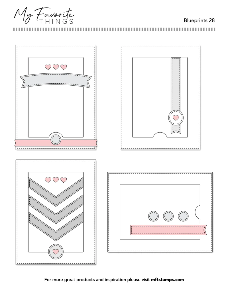Released from the Vault. Blueprints 28 includes everything you need to assemble creative cards for just about any occasion. There's a jaunty feel to this edition of our Blueprints that you're going to love. The main frame features stitching on the outside and a semi-circle notch at the bottom, but there's more than meets the eye. The inside top of the rectangle scores rather than cuts, creating a fun flap. Layer the stitched circles over the notch and tuck a gift card or a cute image behind the clever window opening. Add extra flair with arrows and chevrons or simple sweetness with a row of three hearts. Accessories include one stitched chevron, three banners, two stitched circles, and a trio of hearts. Let your creativity soar with Blueprints 28! This set has been slightly modified from the original release to improve the stitching and remove extraneous elements. January 2024 Release - (8) piece set. Stitched base panel 4" x 5 /4" with 2 3/4" x 4" interior flap, Sentiment strip 4 1/8" x 3/8", Stitched sentiment strip 3 7/8" x 1/2", Curved stitched sentiment strip 3 5/8" x 5/8", Stitched chevron stripe 2 3/4" x 1 1/2", Stitched circles (2) 3/4", 1/2", Hearts (3) 1/4" x 1/4".